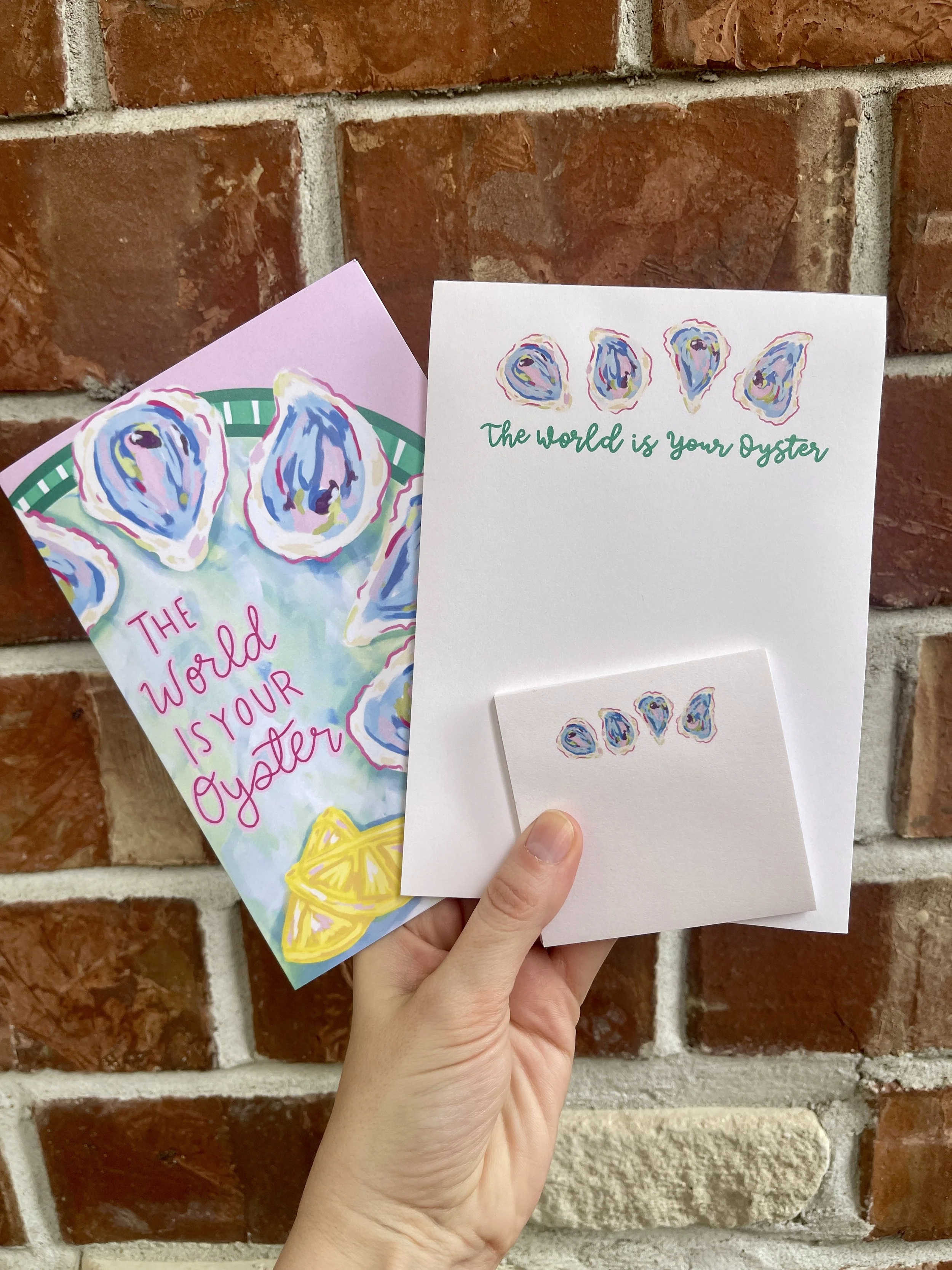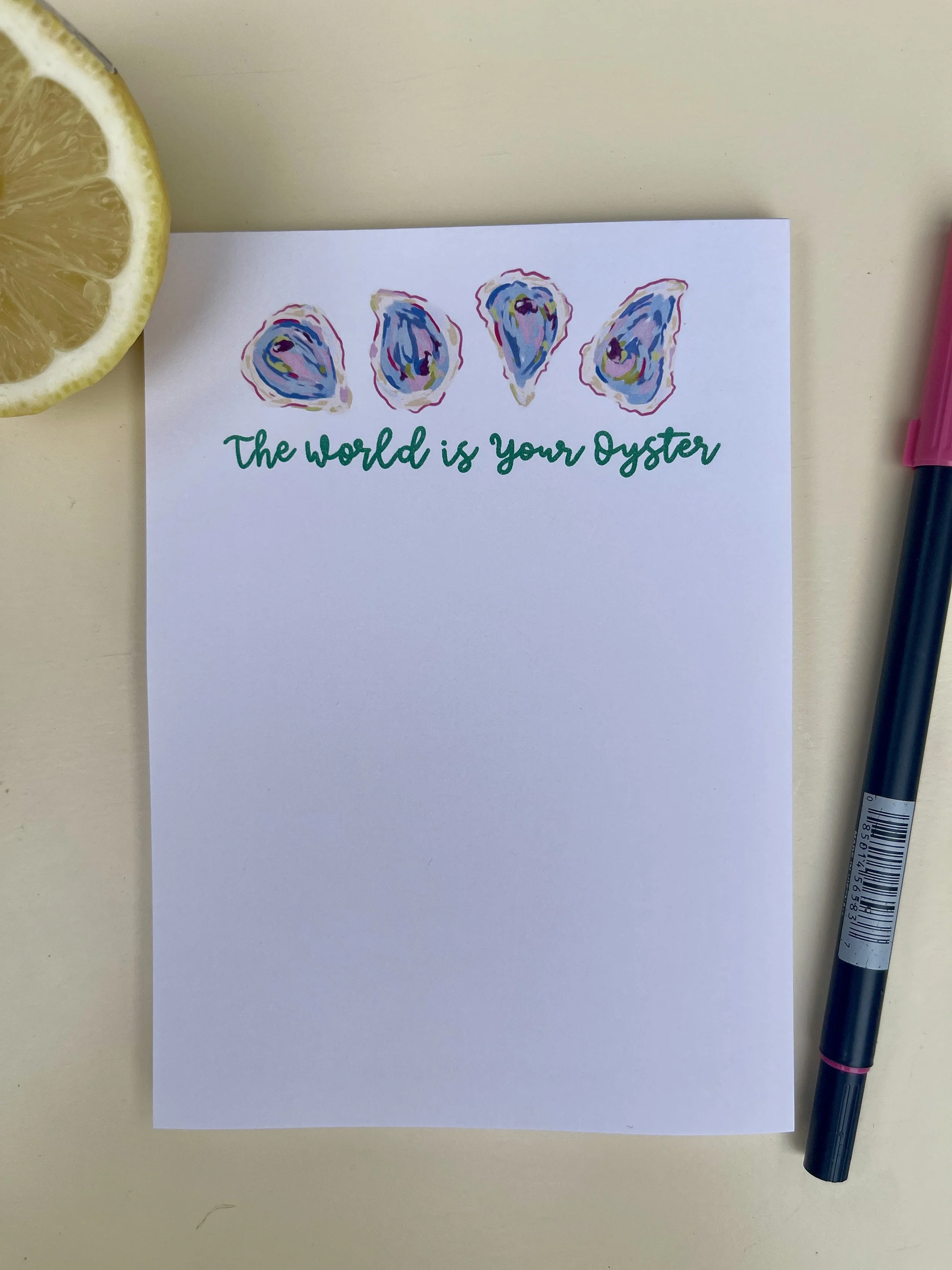Remember the world is your oyster everyday with this adorable 5x7 notepad, decorated with some colorful oysters on an off-white background along with the phrase, "The World is Your Oyster". Pair it with our oyster greeting card and sticky notes to make a perfect gift to yourself or someone special to sweeten their day! Perfect for coastal or beach gifts, cute office stationery, oyster lovers, and more!