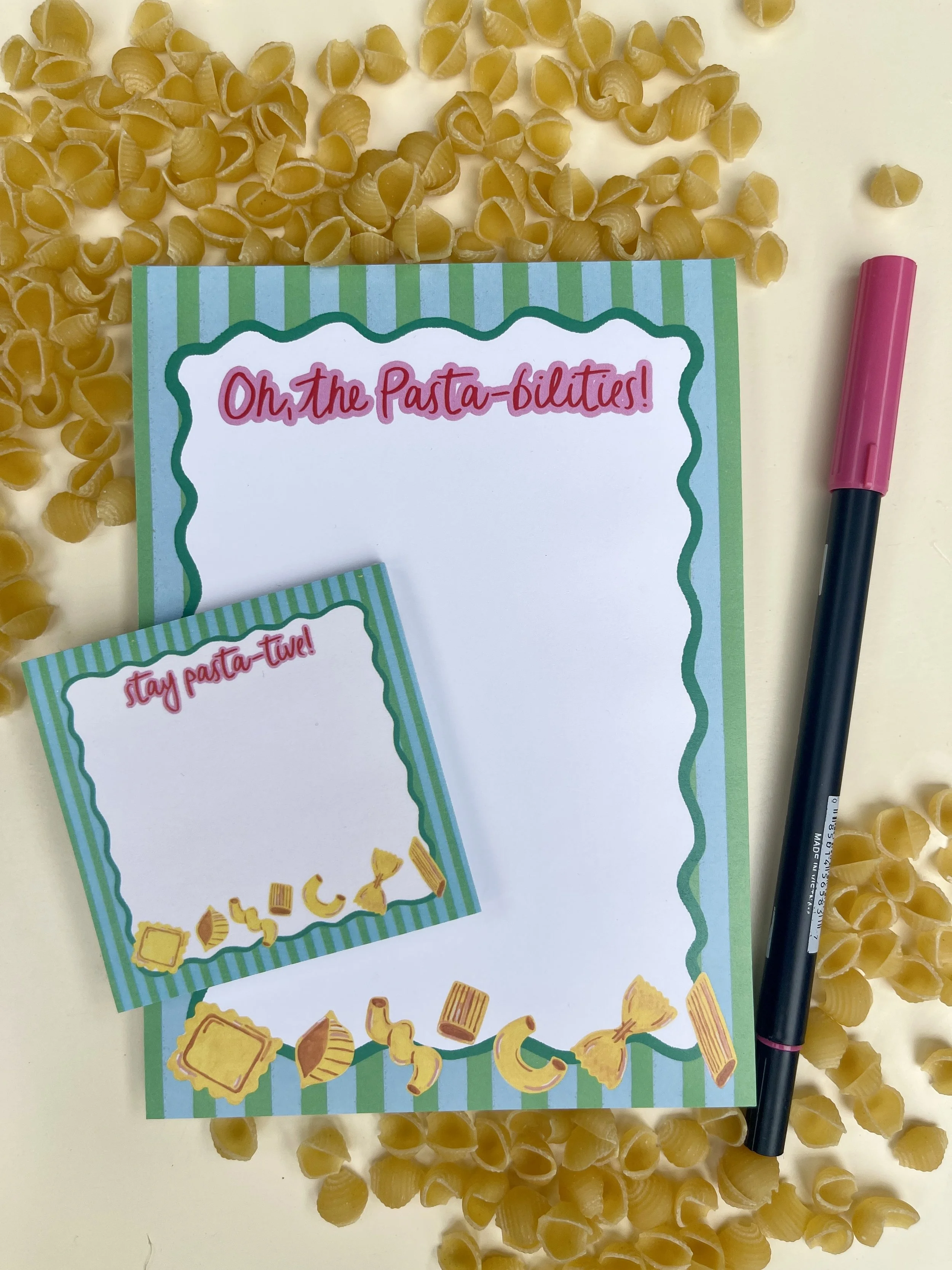 Stay on the pasta-tive side of life with this adorable 3x3 sticky note pad, decorated with different types of pasta on a striped background along with the punny phrase "stay pasta-tive!". Makes a wonderful gift to yourself or someone special to brighten their day. Perfect for carb or pasta lovers, just because gifts, cute office stationery, and more! Pair it with our "You're Pasta-tively the best" card to bring it all together!